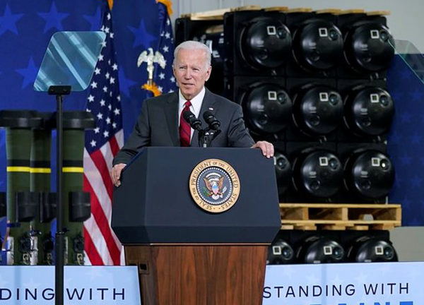 ロッキード・マーチン社のミサイル工場でウクライナへの供与兵器を称賛するバイデン米大統領(昨年5月)