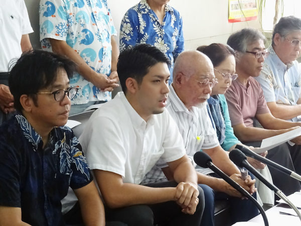 記者会見に臨む「辺野古」県民投票の会のメンバー(7月30日、沖縄県庁)