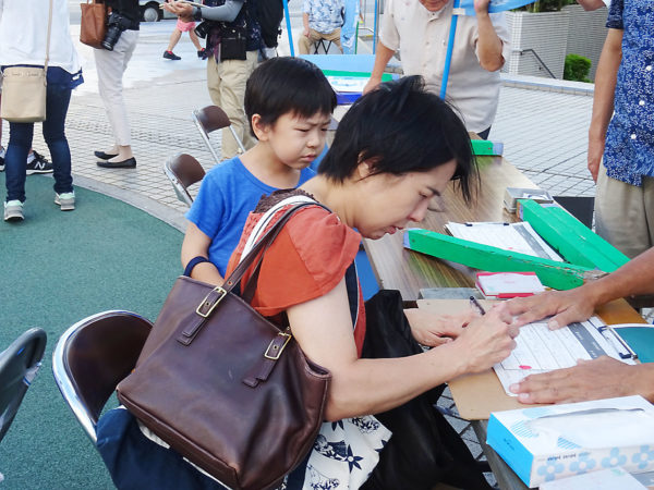 真剣な表情で署名する親子連れ(7月23日、県庁前)