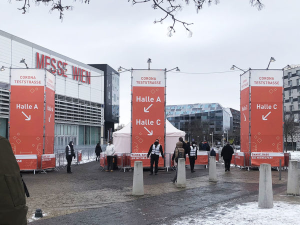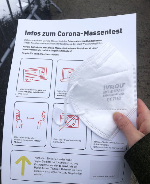 検査当日の静かな雪がチラつく12月の午後、いそいそと近所の大規模コロナ検査所に向かった。この大規模検査所は私の住むウィーン市内には3カ所あり、万博や見本市が開催される大ホールで、各州3日~10日間ほどかけて行われる。検査会場には仮設の門が作られており、ここで係員から場内での注意事項のチラシとFFP2マスクを配布された。