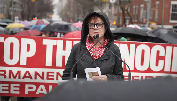ニューヨークの集会で発言する女優スーザン・サランドン(2日)