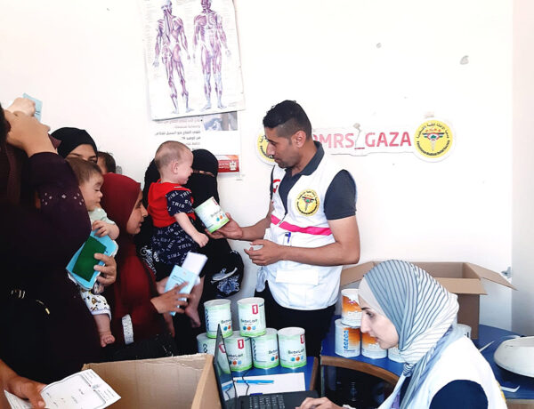私たちのこれらの支援活動は一時中断せざるを得なかったが、2024年4月から、ようやく一部の活動を再開することができた。現在は緊急支援として簡易的な健診に加え、子どもの月齢に合わせた栄養失調予防食(ミルクまたは高栄養ビスケット)の配布を行っている。また、栄養や衛生行動について保護者への講習などを実施し、これまで育成してきたボランティアの女性たちも、避難生活の中、できる限りで活動に参加してくれている。また、過去20年近く協働してきたパレスチナ医療救援協会(以下、PMRS)と共に、乳児用粉ミルクと医薬品の配布も実施している。PMRSはパレスチナ全域で移動型診療などの医療サービスを提供しており、現在はガザの中だけでも40以上のチームが、簡易医療施設や避難所、道端などで人々に医療を提供している。