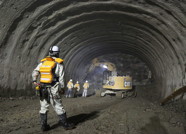 トンネルが貫通し、坑内に「万歳!」の声が轟いたのも束の間、それは工事の半ばでしかなく、完成後の水漏れを防ぐためにトンネル内側全面に防水シートを貼り、鋲打ち機で固定する。それはライトで照らされると、まるで黄金色の幻想的世界だ。さらにシートの内側に人力で鉄筋をくみたて、コンクリート打設を施す。コンクリートの厚さは30~35㌢になるという。最後にトンネル名を刻んだ銘板がとり付けられた瞬間、作業員の目が潤む。現場を見つめる若き現場監督の面持ちも、工事開始前と比べて別人のようにたくましく感じられた。