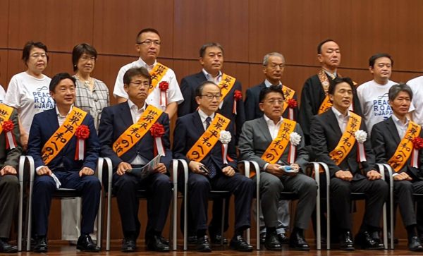 香川県で開催された同じイベントには、香川県実行委員長の平井卓也前デジタル大臣(衆院比例四国)、磯崎仁彦内閣官房副長官、三宅伸吾(参院香川)が参加し、「世界平和への道」と書かれたタスキをかけて記念写真に収まっていた。