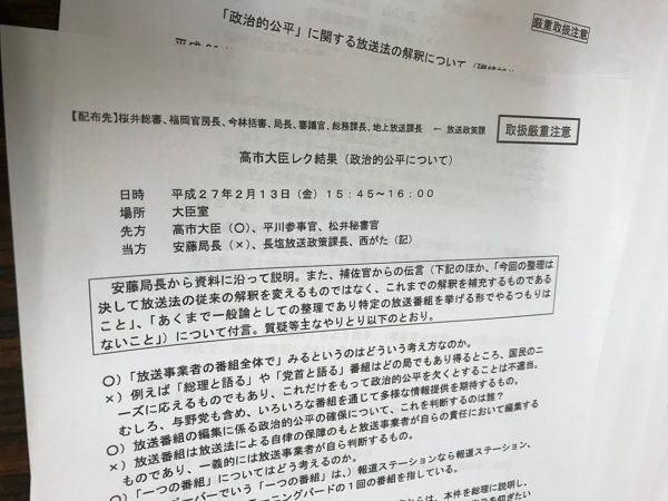 レクの内容を記した行政文書も2014(平成26)年、礒崎陽輔首相補佐官の要請から始まる。TBSの『サンデーモーニング』、テレビ朝日の『モーニングバード』『報道ステーション』などを名指しし、「一つの番組でもおかしい場合がある」(礒崎)として、従来の「番組全体」ではなく、一つの番組だけでも政治的公平に抵触する場合があると解釈できるように総務省に強硬に働きかけていたことがうかがい知れる。