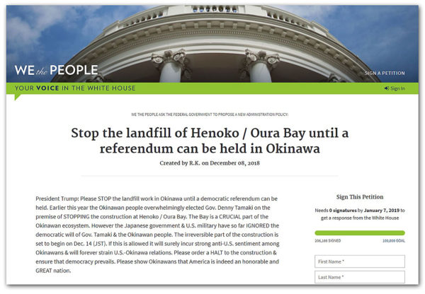 B 一方、県民の民意を無視して安倍政府が強行すればするほど、辺野古の埋め立ては国内だけでなく国際的な注目を集めている。この間、ホワイトハウスのトランプ大統領に対し、県民投票の実施まで埋め立て工事のストップを求める電子署名活動がおこなわれ、開始から10日で10万人に達し、1カ月で20万人をこえた。請願署名が1カ月で10万人をこえた場合は政府が直接回答するというホワイトハウスの制度を利用したもので、米政府は60日以内の回答を迫られている。