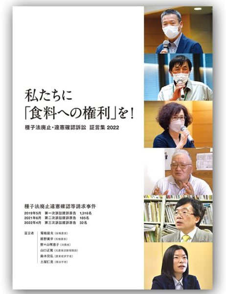 今年6月3日にあった第7回口頭弁論では、原告の菊地富夫氏(採種農家)、舘野廣幸氏(有機農家)、野々山理恵子氏(消費者)、証人として山口正篤氏(元農業試験場職員)、鈴木宣弘氏(農業経済学者)、土屋仁美氏(憲法学者)の計6人が証言をおこなった。「TPP交渉差止・違憲訴訟の会」「TPP交渉差止・違憲訴訟弁護団」は、今年9月、その証言を収録した冊子『私たちに「食料への権利」を! 種子法廃止・違憲確認訴訟 証言集2022』(A4判、68ページ、定価・税込700円、送料別)を発行しており、本裁判の経緯や種子法廃止の問題点について詳しく伝えている。