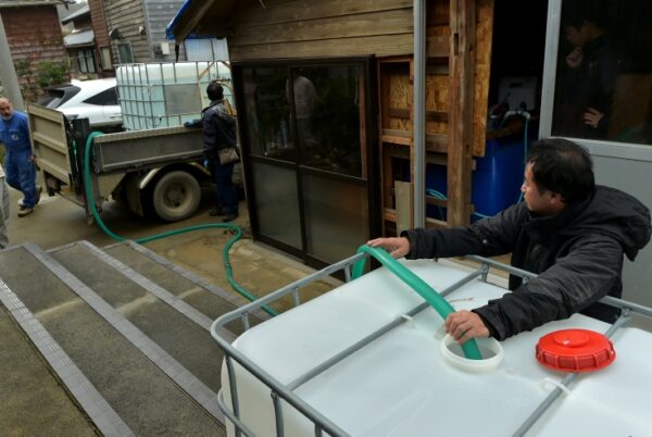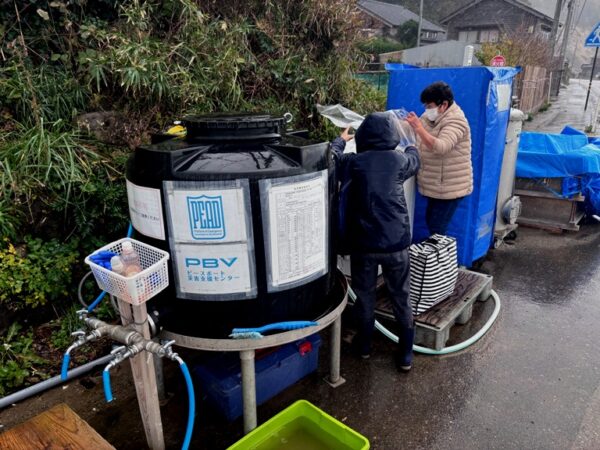 また大谷地区では、元日の震災以降、全域で現在まで断水が続いている。避難所にも上水道が通っておらず、豪雨災害も加わったため復旧のメドはついていない。NPOによっていくつかの給水スポットがもうけられているが、高齢者が毎日水をくみに来ることは難しい。そのため民間のボランティアが組織され、住民から要請があれば500~1000㍑のタンクを各家に設置し、井戸用ポンプと組み合わせて水圧を調整することで家の蛇口から水が出るようになった家もある。