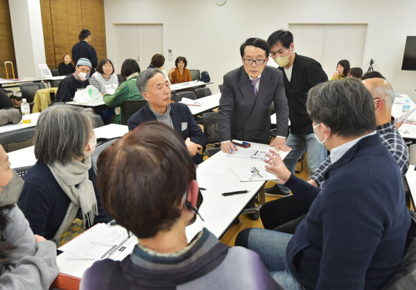 鈴木氏の講演の後、参加者同士で複数のグループに分かれて鈴木氏の話の内容の感想や疑問などを出し合い、さらに理解を深めたい内容や国に対して要望したいことなどについて話し合った。参加者のなかには農業従事者も多く、一般参加者が生産現場の実情について質問したり、そこに鈴木氏も混ざって一緒に議論を深めた。参加者が政治課題について考え、どのように政策に生かしていくかを議論し、今後のれいわ新選組の活動にも生かしていくために意見や要望をワークシートに記入して提出した。