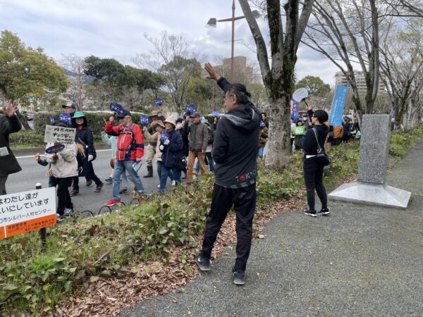 デモ行進に沿道からも声援が飛んだ(3月30日、山口市)