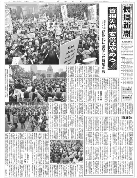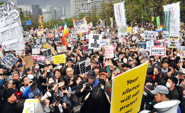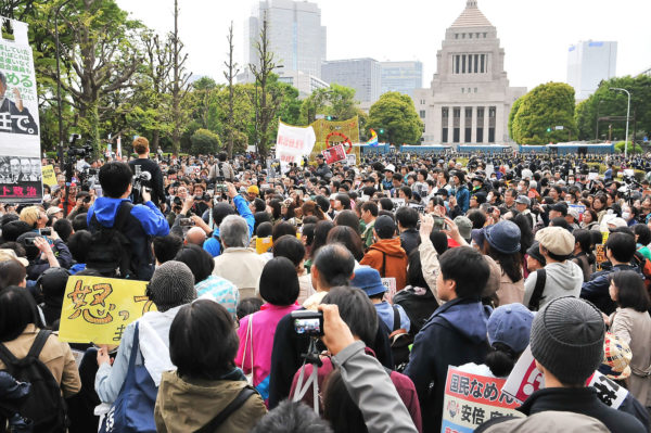 国会議事堂前で14日、「安倍政権は退陣を! あたりまえの政治を市民の手で! 0414国会前大行動」とする抗議集会がおこなわれた。安保法制に反対する行動を呼びかけてきた総がかり行動実行委員会や「未来のための公共」などの若者グループが主催し、首都圏をはじめ全国からのべ約5万人(主催者発表)が詰めかけた。連日おこなわれてきた官邸や国会前での抗議行動の積み重ねのうえで「国会前大集合」を呼びかけ、森友学園問題や自衛隊をめぐる公文書の隠蔽・改ざんに手を染めた安倍政府に抗議するとともに、早期退陣と国政正常化を要求した。3年前の安保法制に反対するデモに次ぐ大規模な行動となった。