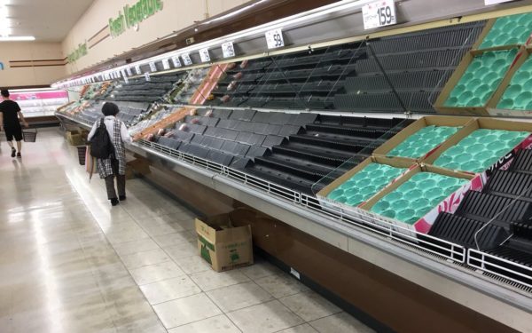 物流が止まり、食品が消えたスーパー(8日、呉市内)