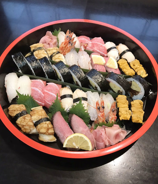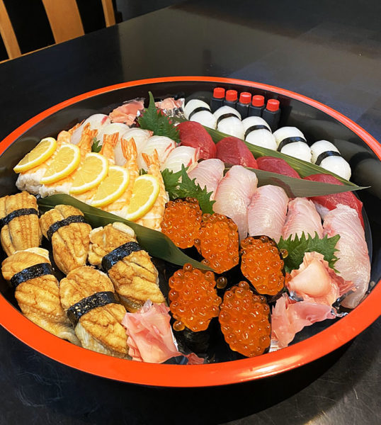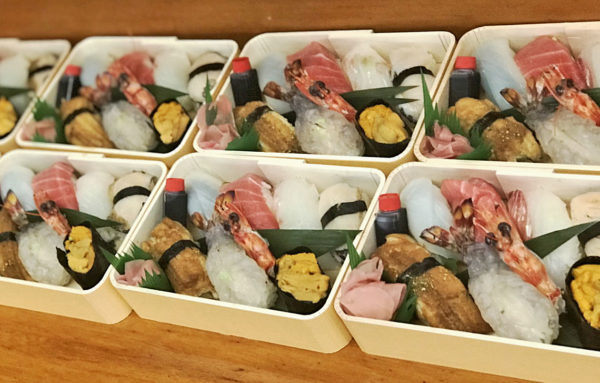 大将のおすすめは、にぎりと、穴子の入った上太巻き。店舗で食すのと変わらないクオリティをたもつため、鮮度のいいネタを使用し、消毒済みの使い捨て容器にマスク・手袋を着用してにぎっている。しばらくの間不定休にしており、予約があれば受けることが可能だという。