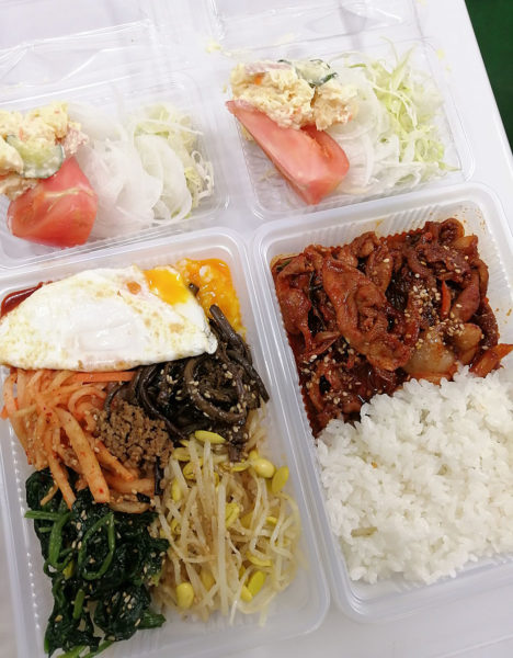 テイクアウトのビビンバと豚肉ピリ辛炒め(各620円)