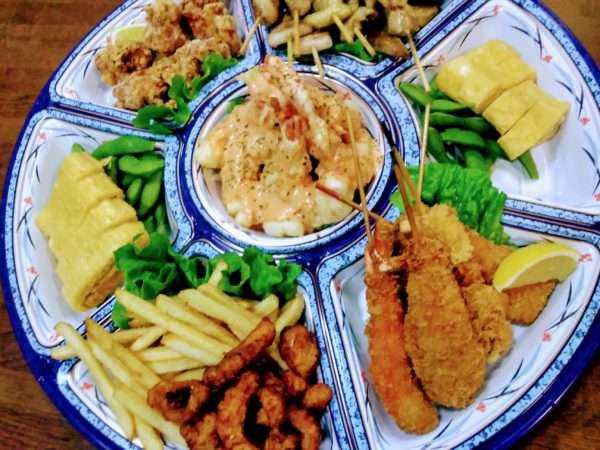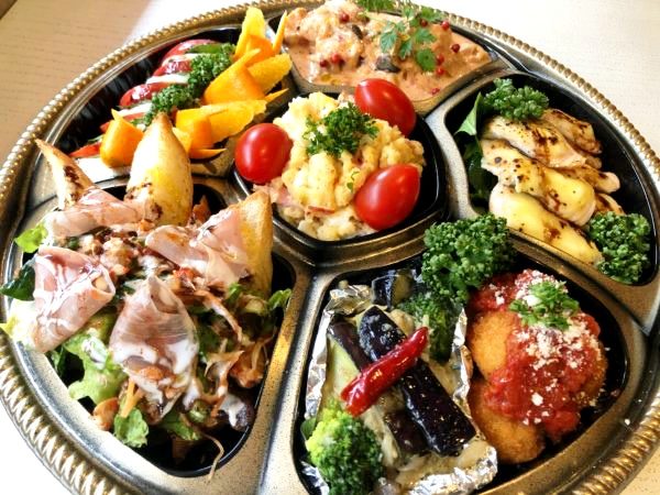 夜は焼き鳥や居酒屋メニューを詰め合わせたオードブルがおすすめ。焼き鳥10本盛り合わせ1000円、オードブル3900円(4人前)。オードブルは電話予約より2時間後には引き渡し可能。