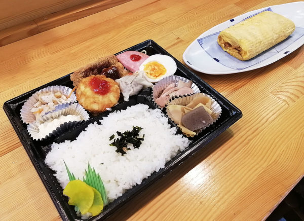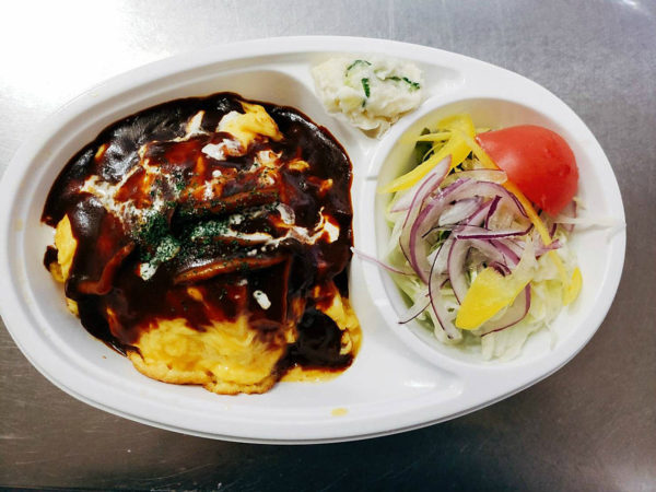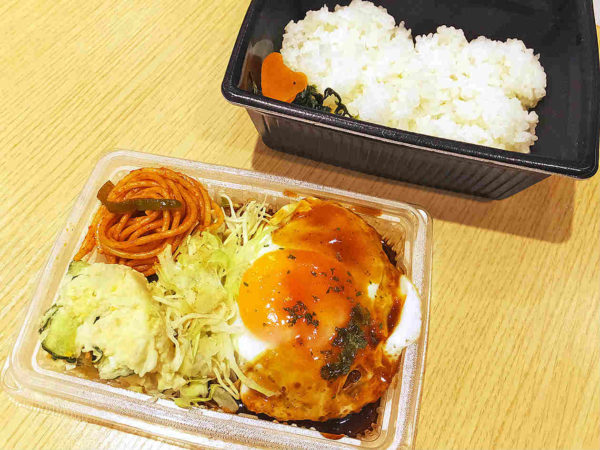 弁当は希望の価格に合わせておかずを詰め合わせることができるという。650円程度~。写真のハンバーグ弁当は、目玉焼きの乗ったハンバーグ、ポテトサラダ、ナポリタン、千切りキャベツに漬物の乗ったご飯が付いて700円。