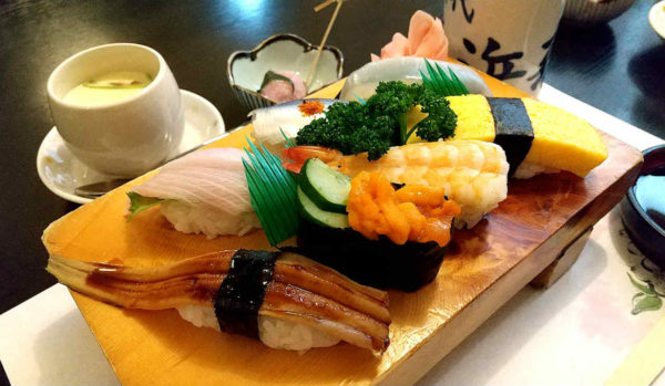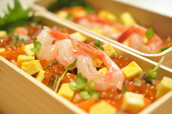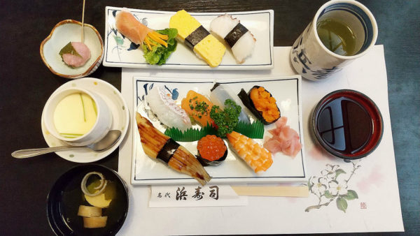 メニューは上にぎり2300円(7貫)、特上にぎり3400円(7貫)、おまかせにぎり5000円(その日のおすすめ10貫)、太巻き寿司900円(1本)、上太巻き1600円(1本)。サイドメニューも、あわびバター焼き(2800円)、天然刺身五種盛り(1800円)、地魚西京焼き(980円)、関門たこ天麩羅(820円)、ほたるいか磯部揚げ(820円)、国産あさりバター焼き(980円)、生しらうお磯部揚げ(750円)など20種のメニューの中から注文することができる。