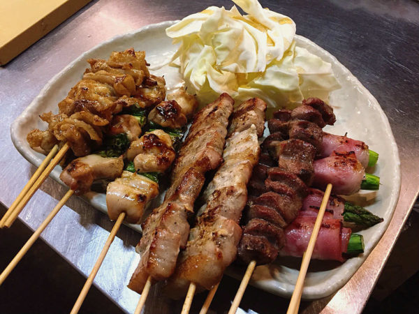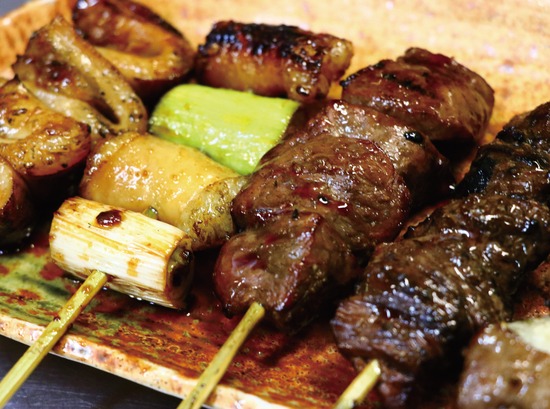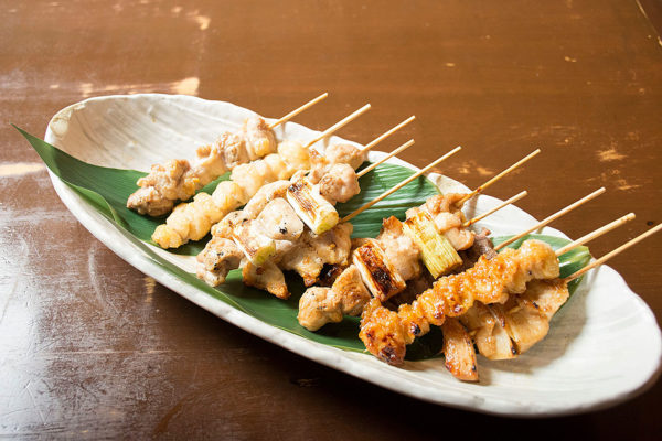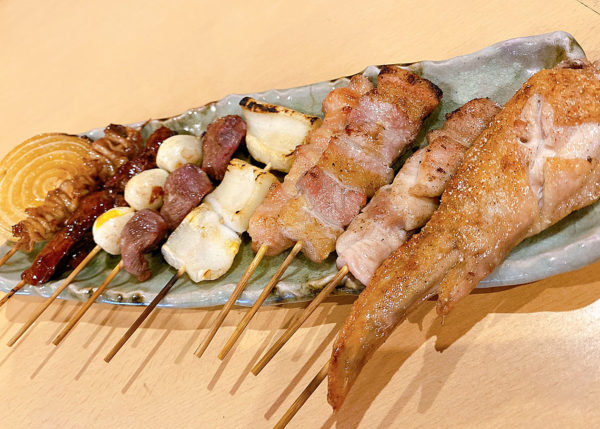 「やきとり串」は山口県産の長州鳥を使用。鶏もも150円、ねぎま150円、鶏ささみ130円、砂ずり130円、手羽先150円、鶏皮130円、ささみワサビ150円などがある。