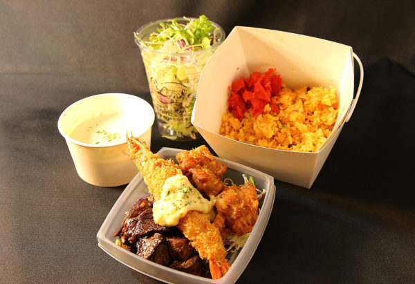 ピラフメニュー(カップサラダ付)は、クイーンステーキBOX…1500円、ロイヤルピラフBOX…1500円、カツピラフBOX…850円、ハンバーグピラフBOX…850円、ベーコンピラフBOX…750円、エビピラフBOX…750円、山菜ピラフBOX…750円、カツウェディングピラフBOX(自家製のホワイトソース付)…950円、ハンバーグウェディングピラフBOX(自家製のホワイトソース付)…950円。ドリアまたはグラタンは650円で、三元豚のカツ、デミグラスハンバーグ、ベーコン、海老、たらこと海老の5種。自家製和風野菜ドレッシングのカップサラダは200円となっている(価格はすべて税込み)。