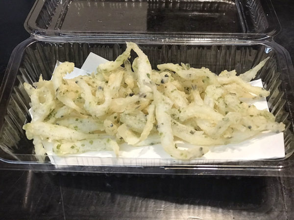 木曜日はオムレツ、月~土曜日はエビと貝柱のかき揚げ、月・水・金はレバーの日となっているほか、日替わりで2品販売している。