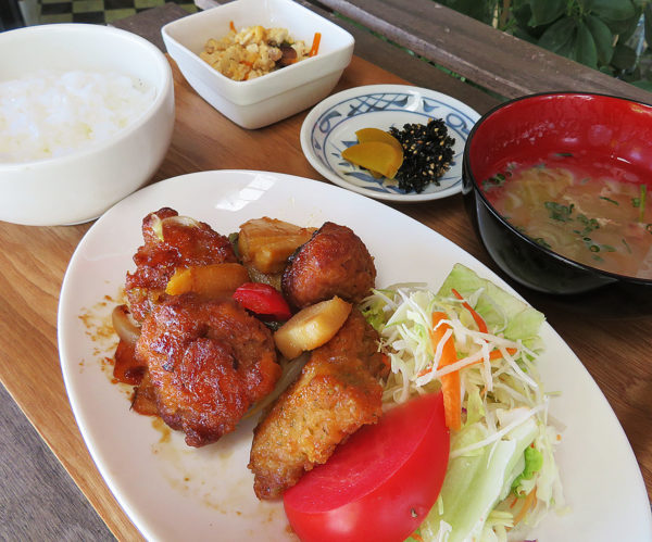 営業は午前9時からのモーニングセットにはじまる。午前11時からの日替わりランチも本格的(午後2時まで)。日替わりランチは、肉か魚をメインに副菜と漬物、味噌汁、食後のコーヒー付きで600円(税込)。この日のメニューは鶏の黒酢炒めとトマト・サラダ、炒り豆腐、ごはん、豚汁。揚げものが続かないようバランスを考えたり、野菜も地物を中心に使い、魚は下関で水揚げされたものを主体にする。低価格でも工夫して豊富なメニューを提供している。