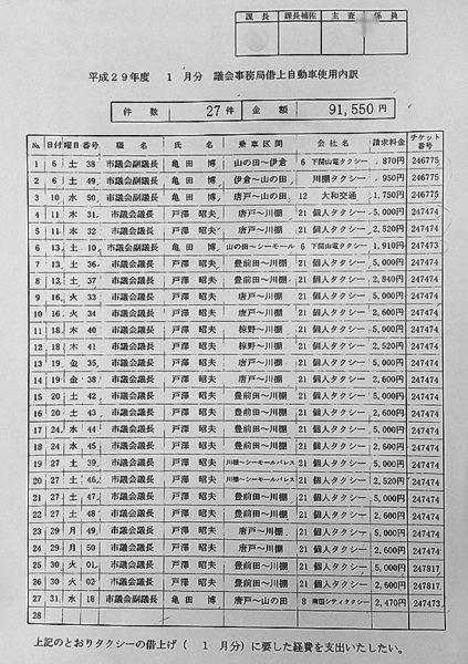 公用タクシー券は、私用に使っても市議会事務局には分からないようなシステムになっており、公金が大変杜撰な手続きで支出されている。使用基準に合おうが合うまいが、そんなことには関係なく、公用タクシー券が四人の議員に渡され、使用された代金がそのまま支払われている。