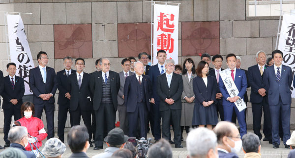 下関市長選で前田陣営の壇上にあがる自民党議員ら(2021年3月、下関市)