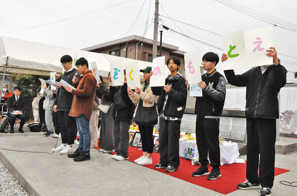 長生炭鉱犠牲者の追悼集会で発言する日韓両国の中学生たち(3日、宇部市)