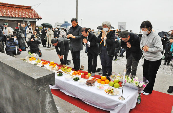 長生炭鉱(山口県宇部市)水没事故から2月3日で82年を迎えた。「長生炭鉱の水非常を歴史に刻む会」は3日、同市床波の長生炭鉱追悼ひろばで犠牲者追悼集会をおこなった。韓国から訪れた犠牲者の遺族や韓国政府関係者、地元の住民、韓国、日本の中学生など約130人が参列した。今なお海底に眠る183人を追悼するとともに、遺骨を故郷に送還するために、刻む会は「何があっても今年中に坑口を開ける」決意を表明した。