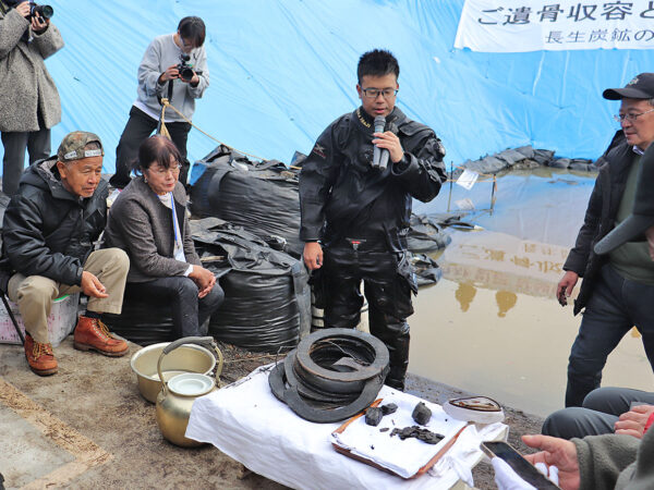 1回目は、午後2時過ぎから水中探検家の伊左治佳孝氏が坑道に通じる坑口から潜り、約1時間半後、命綱を頼りに坑道内を約250㍍進んだところで戻ってきた。「水中に構造物が多く、まるでジャングルジムをくぐり抜けるようだった。10分かけて20㍍を進むような感じで、手探りのなかで抜けられる場所を探しながらだった」と語った。