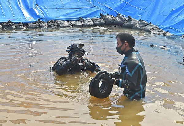 海底坑道内の潜水調査をおこなうダイバーたち(2日、宇部市床波)