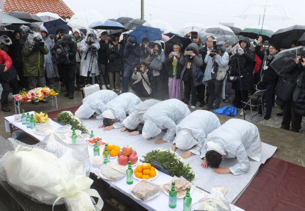 長生炭鉱水没事故犠牲者追悼碑前でおこなわれた韓国式の法事「チェサ」(1日、宇部市床波)