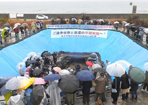 1942(昭和17)年2月3日に山口県宇部市の長生炭鉱で起きた水没事故で亡くなり、海底に遺骨が残されたままの犠牲者183人(うち朝鮮人労働者が136人)を悼む83周年犠牲者追悼集会(主催・長生炭鉱の水非常を歴史に刻む会)が1日、宇部市床波の長生炭鉱追悼ひろばで開かれた。昨年の追悼集会で、刻む会の井上洋子共同代表は「市民の力で坑口を開ける」と宣言し、9月に坑口を見つけ出し、10月には専門ダイバーによる潜水調査も実施するなど、遺骨収容と返還に向けて確実に歩みを進めてきた。長生炭鉱の遺骨発掘返還運動は全国的にも注目を集め、日韓の国会でも遺骨返還が議題に上がり始めている。83年目の追悼集会には、こうした世論の広がりを背景に韓国政府代表や韓国総領事、日本の国会議員らも参列。韓国・日本人遺族や韓国から100人の訪問団が参列し、県内や全国各地からの参加者などを含めて約450人が参列した。戦後80年、日韓国交正常化60年の節目の年に、「日韓政府の共同事業として遺骨返還を」という世論が着実に大きなうねりとなっていることを反映した。なお1月31日から3日間、坑口からの潜水調査もおこなわれた。