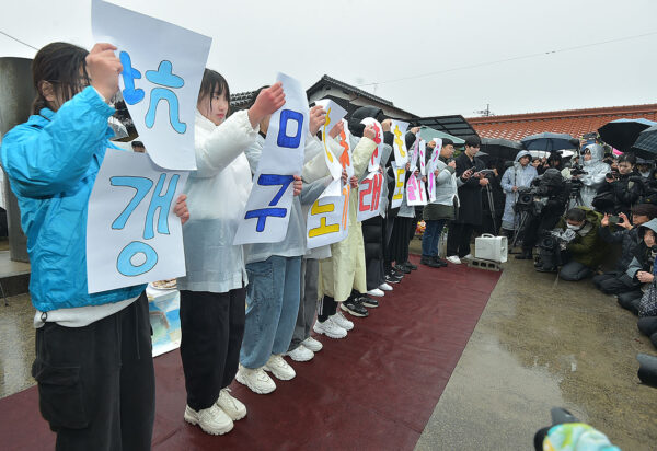 潜水調査を前にダイバーを激励する日本や韓国の遺族たち(2日)