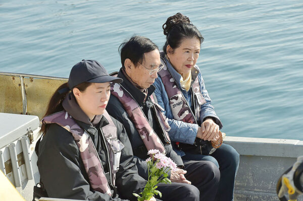 慰霊のため船でピーヤや事故現場付近に向かう韓国の遺族たち(3日)