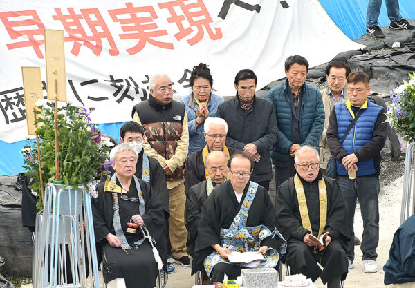 坑口で読経をあげながらダイバーの安全と無事を祈願する日韓の僧侶たち(1日)