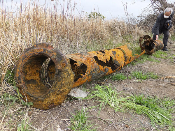 ピーヤから引き上げられた鉄管。潜水調査を阻む堆積物の一つ(2日)