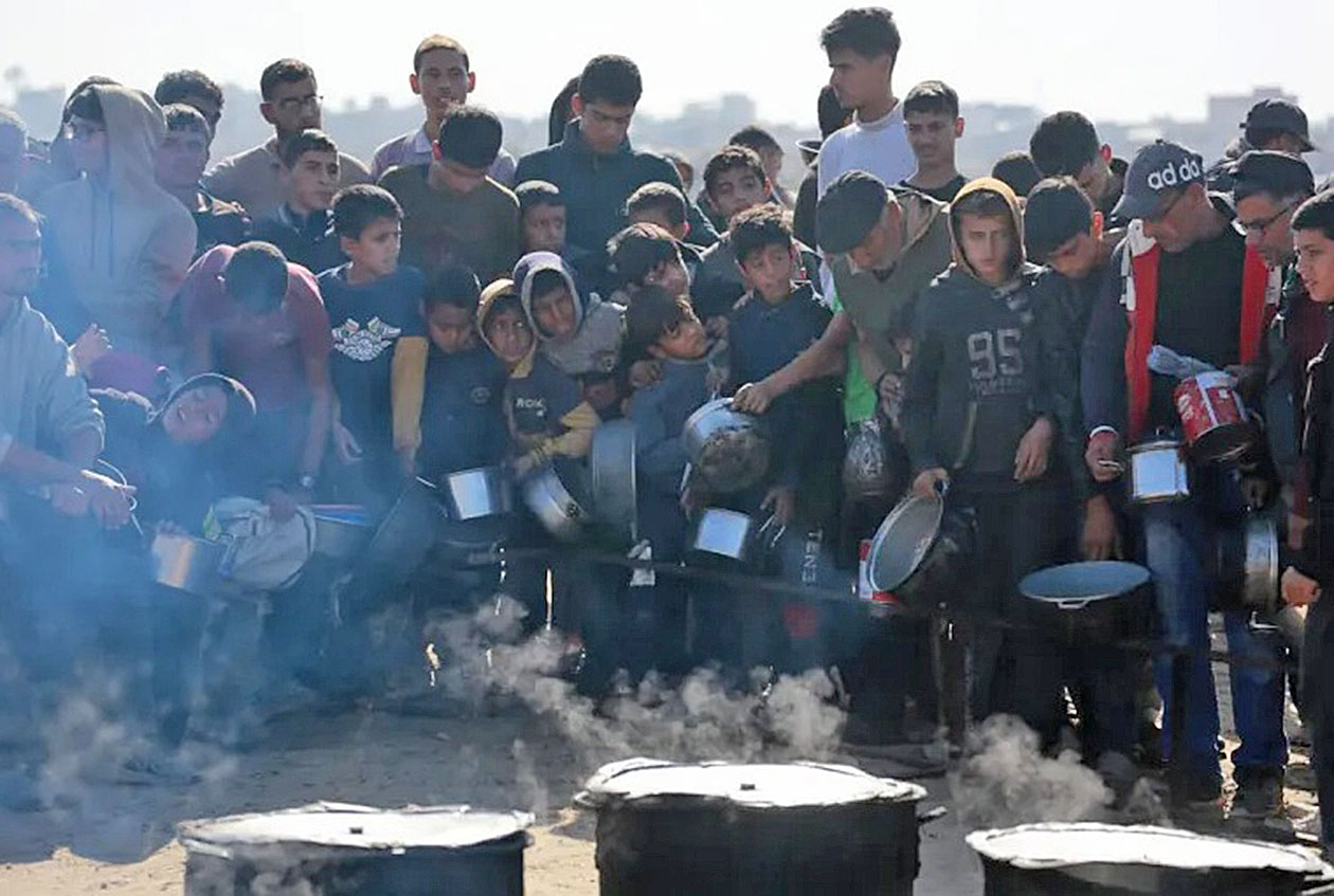 イスラエルの封鎖により深刻な飢餓に陥っているガザ。ガザ地区南部のハン・ユニス南部の配給センターで食糧配給を待つ子どもたち(17日)