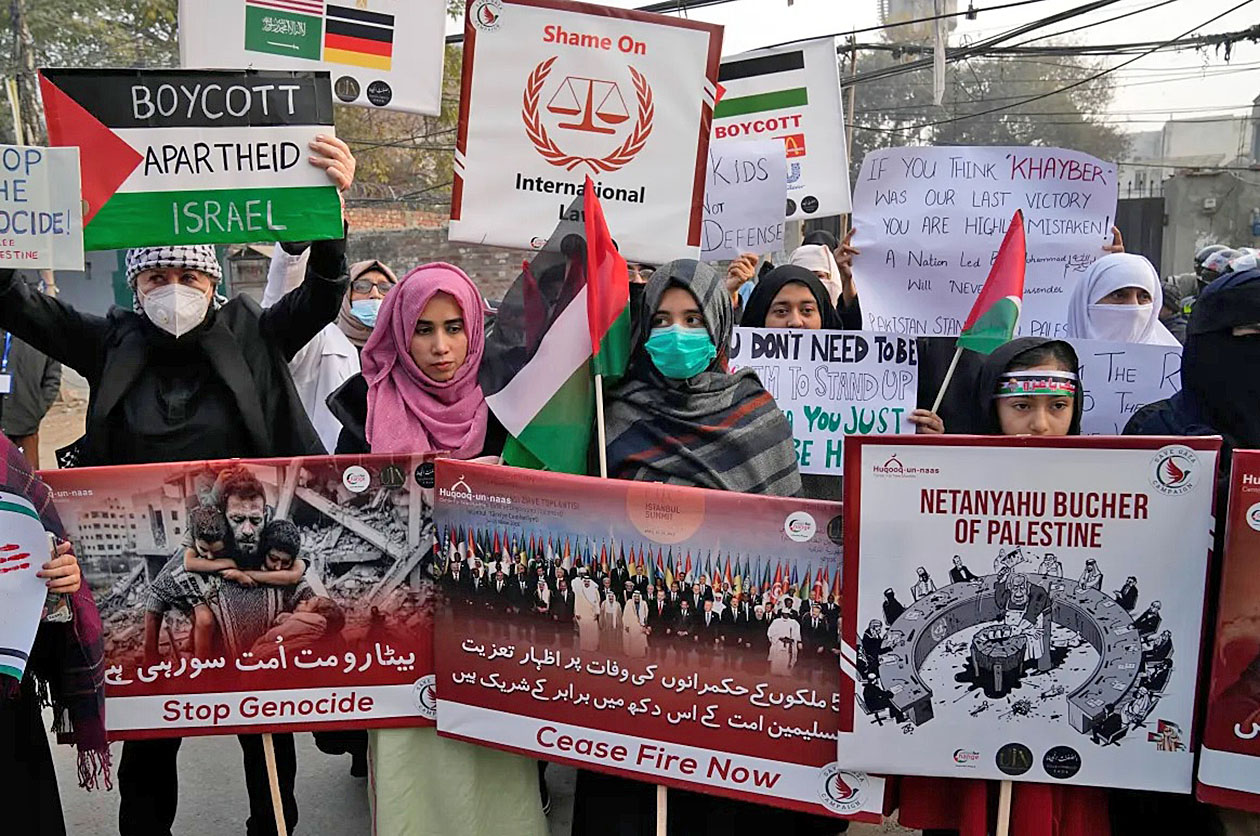 パキスタンのラホールで、イスラエルの空襲に対する抗議活動とパレスチナ人との連帯を示すためにプラカードを掲げるパキスタン人