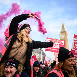 LONDON, ENGLAND – DECEMBER 09: A woman waves a smoke flare as striking mail workers and supporters gather in Parliament Square to listen to speeches by union leaders and representatives on December 9, 2022 in London, England. Royal Mail workers are staging strikes throughout December in an escalating row over pay, jobs and conditions. (Photo by Leon Neal/Getty Images) (Photo by Leon Neal/Getty Images)