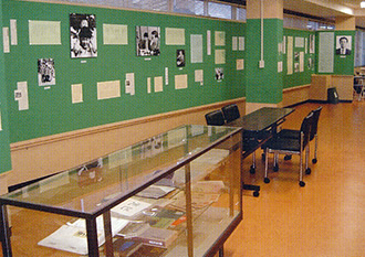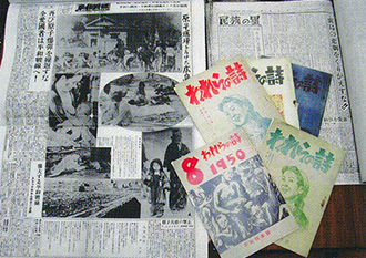 詩誌「駱駝」をはじめ直筆原稿、蔵書なども、峠三吉資料とともにガラスケースに展示。