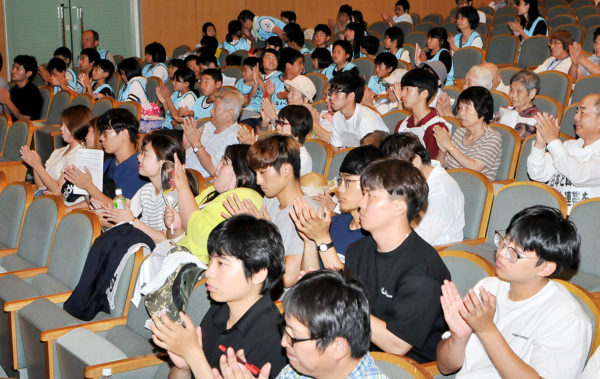 続いて「広島に学ぶ小中高生平和の旅」の約30人が登壇し、5日に被爆体験を学んだ感想を軸に構成詩を発表した。「辛くて苦しいことを僕たちに伝えてくれた。もし僕がその年代に生きていたらすごい声で叫んで泣いていたと思う。それをみんなに伝えて戦争は本当にいけないことだと知らせていると感じた」(小学校5年男子)など元気よく発表し、峠三吉の詩「序」の群読、「青い空は」の合唱をおこなった。