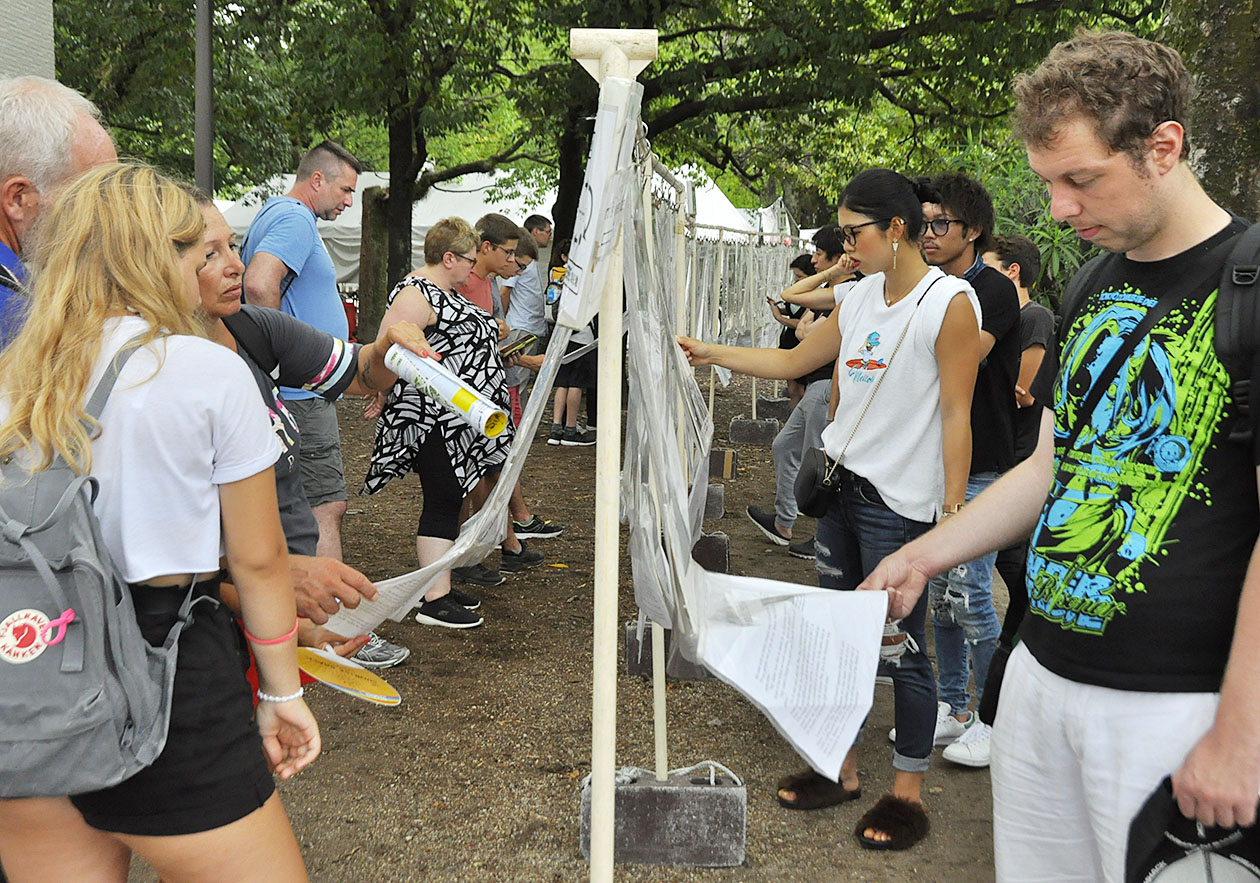 平和公園にある原爆の子の像前での街頭展示は多くの外国人が参観していった