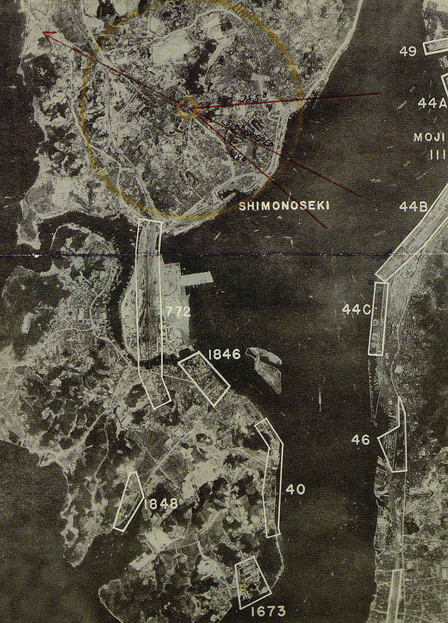 関門海峡の偵察写真から爆撃地の指定箇所を示している。上部の円の中が唐戸地区で焼夷弾攻撃を指示。「1846」三菱、「772」下関駅などは攻撃しないよう指示していた。