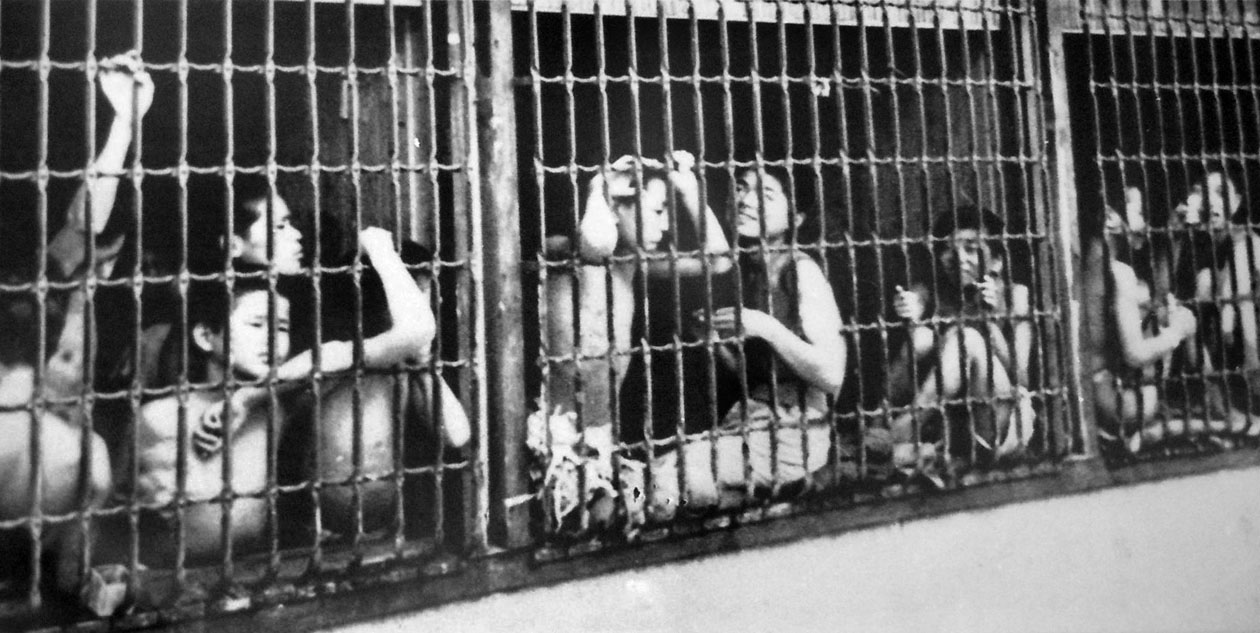 占領軍の政策で収容所に隔離され、鉄格子の檻に閉じ込められた戦災孤児たち(1946年7月)