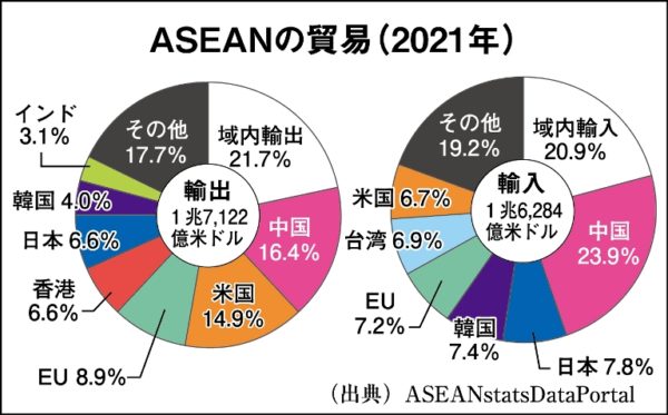 だが日米豪韓、インド、東南アジア諸国など14カ国が参加したものの、インドを含めてASEAN(東南アジア諸国連合)との溝はまったく埋まらなかった。なぜかといえば、ASEANの国々は米中対立において「米国を選ぶか、中国を選ぶか」「民主を選ぶか、独裁を選ぶか」という二項対立論に巻き込まれるのを非常に嫌がっている。たとえば10年前の日本のASEANに対する経済力と、今の経済力とを比べると、10年前はASEANに対する日本の輸出入はトップだったが、今は中国がトップであり、それも日本の3倍以上だ【グラフ参照】。