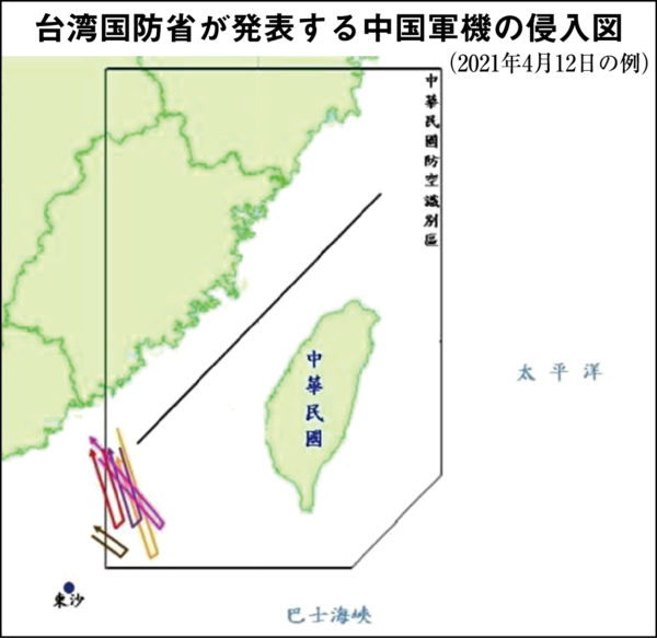 ところが台湾国防部は、米中関係が緊張した2年前から毎日のように「中共の戦闘機がわが防空識別圏に進入した」と発表するようになった。地図を見てもわかるように進入しているのは防空識別圏ギリギリの場所(地図内の色付き矢印)だ。これが「台湾の空域を侵した」という説明になる。