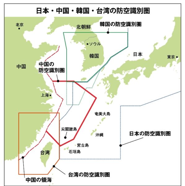 中国大陸にまで張り出している台湾防空識別圏は、1952年、日本が沖縄を切り離して独立したサンフランシスコ講和条約が結ばれた年に米軍が引いたものだ。当時、まだ米国と中華民国(現・台湾)には国交があり、同盟関係があった。したがって中国軍の侵入を阻止するために米軍が引いたわけだ。台湾はいまだに米国が引いたこの防空識別圏に沿って、中国空軍の行動に対する対応計画を進めている。