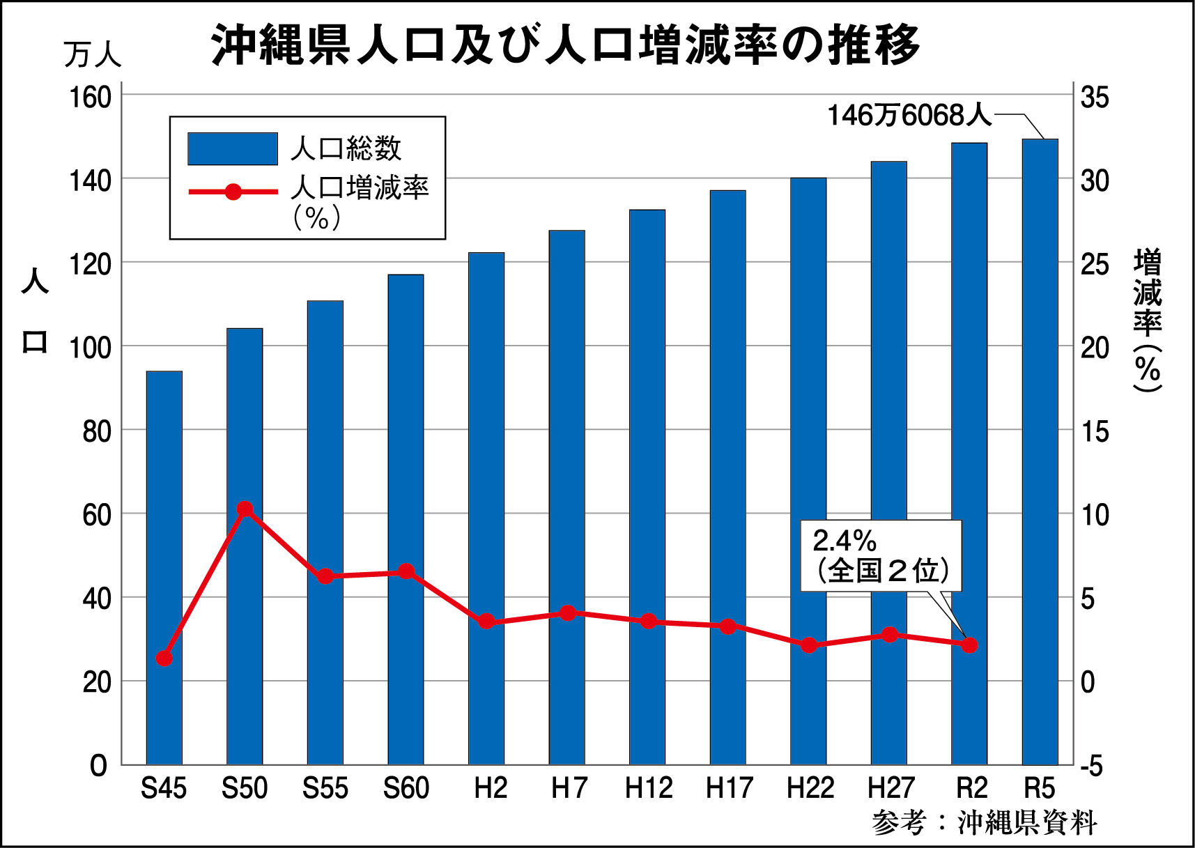 2@1A比が図 沖縄県人口及び人口増減率の推移