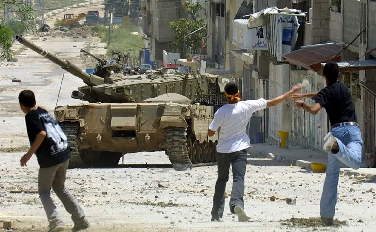 第2次インティファーダ(2000~2005年)で、イスラエル軍に投石して抵抗するパレスチナ人